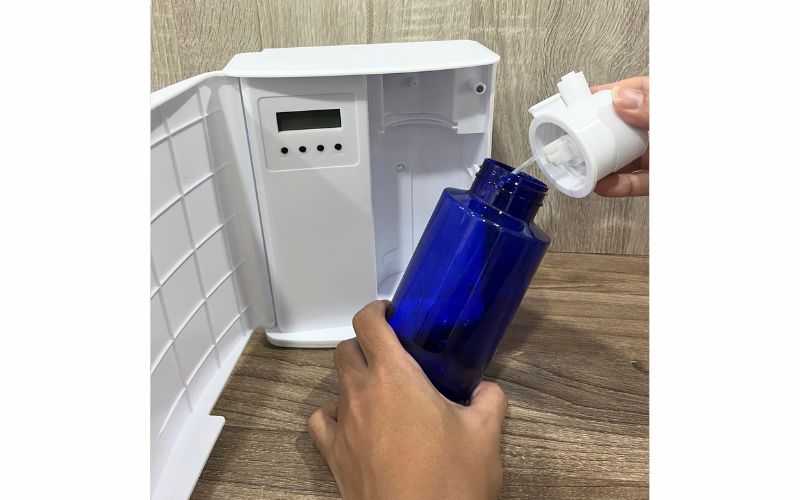 Tiếp theo, tháo bình chứa và đổ hết tinh dầu còn lại trong đó. Nếu để tinh dầu đọng lại trong thời gian dài, nó có thể gây ra sự phát triển của mầm mốc và nấm mốc. Từ đó dễ dẫn đến tình trạng tắt vòi phun.